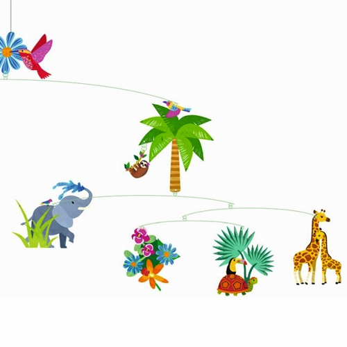 Avventurati nella giungla misteriosa! Qua succede sempre qualcosa di interessante, leoni, zebre, giraffe, elefanti, tutti che si spostano senza sosta creando sempre nuove acrobazie e composizioni. Rallegra e movimenta la cameretta, ottimo anche sopra il fasciatoio per distrarre i piccolini. Attenzione: non è un giocattolo è un oggetto decorativo.